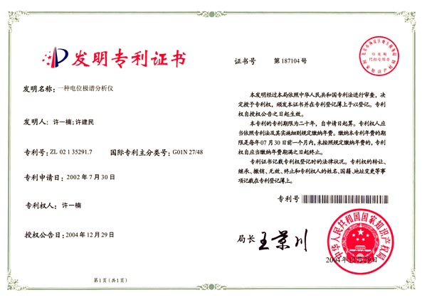 現(xiàn)在又新領企業(yè)另創(chuàng)新的事業(yè),公司堅持原始創(chuàng)新,不作低水平的重復,擁有一批自主知識產(chǎn)權(quán),獲授權(quán)電化學分析儀器方面發(fā)明專利兩項,實用