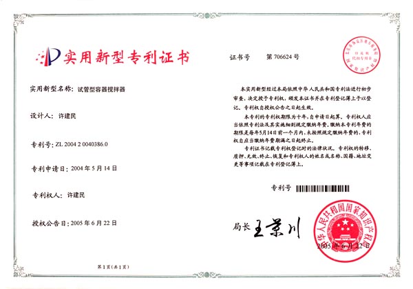 微量元素分析儀中試管型容器攪拌器專(zhuān)利證書(shū)